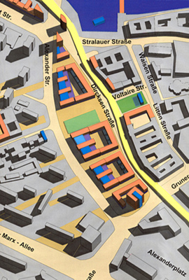 Haupterschließung für das Quartier in Nord-Ostrichtung bilden die zwei Alleenstraßen der Alexanderstraße und der Dirksenstraße. Die Alexanderstraße bleibt Hauptdurchfahrtstraße, wird als Boulevard ausgebildet und erschließt das Quartier. Zusätzlich neue Wegebeziehungen erschließen die DDR-Plattenbausiedlung der 60er Jahre von der Alexanderstraße aus. Fußläufig findet ein Wegesystem zum Plattenbauareal statt, die im Erdgeschoß entkernt werden und mit gewerblicher Nutzung versehen sind. Entsprechend ebenerdige Aufenthaltsebenen im Bereich der Plattenbauten, mit den beschriebenen Gewerbeeinheiten, stärken die Raumbezüge. Das S-Bahnviadukt in der Dirksenstraße wird durch eine raumbegleitende Bebauung ergänzt. Das Thema der gewerblich genutzten S-Bahnbögen wird von den gegenüberliegenden Gebäuden übernommen und stärkt das Potential der Struktur. Mit dem Verzicht auf den Autotunnel der Grunerstraße ist eine ebenerdige Verbindung Richtung Alexanderplatz und Hackeschen Markt gegeben. Die Dirksenstraße wird verkehrsberuhigt ausgebildet. Die Quererschließung von der Dirksenstraße führt in die DDR-Plattenbausiedlung, so daß die Querung auch das anliegende Quartier neu strukturiert und anbindet. Zentrum des Quartiers bildet die Platzanlage, die zur Freizeit und Erholung dient und gleichzeitig die quartiersübergreifenden Verbindungen formuliert und gewährleistet. Die schräggekippte Platzfläche ist jeweils an der Alexanderstraße und an der Littenstraße angehoben. Sie läuft auf das S-Bahnviadukt auf Nullniveau aus, um die raumübergreifende Beziehung herzustellen. Verstärkt durch ein seitliches Lichtband parallel zur Voltairstraße. Das historische Molkenmarktviertel mit den angrenzenden Altbauten mit Mauerbereich wird durch die Gebäudekörper integriert.